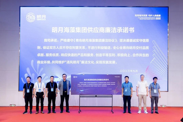 隨后,在集團副總裁李振廣詳盡地為大家解讀供應商管理和質量管理體系的相關內容后,7家戰略供應商代表上臺簽訂《青島明月海藻集團供應商廉潔承諾書》。