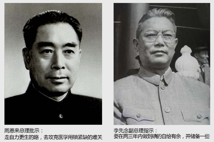上世紀 60 年代 ,是一個嚴重缺碘的年代。碘是國家的重要戰略物資,對于國計民生有著舉足輕重的作用。新中國成立后,我國所需要的碘基本依賴進口。隨著“冷戰”的加劇,西方國家對我國實行經濟封鎖,并采取“禁運”政策中斷了我國碘的來源。為了打破“封鎖”,從根本上改變我國缺碘的嚴峻形勢,周恩來總理作出重要批示:“走自力更生的道路,去攻克醫學用碘緊缺的難關?!崩钕饶罡笨偫碇甘荆骸耙趦扇陜茸龅降獾淖越o有余,并儲備一些。”