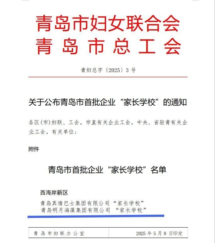 近日,青島市婦聯、青島市總工會聯合公布了青島市首批企業“家長學校”名單,青島明月海藻集團成功入選,成為青島市首批20家獲此殊榮的企業之一。
