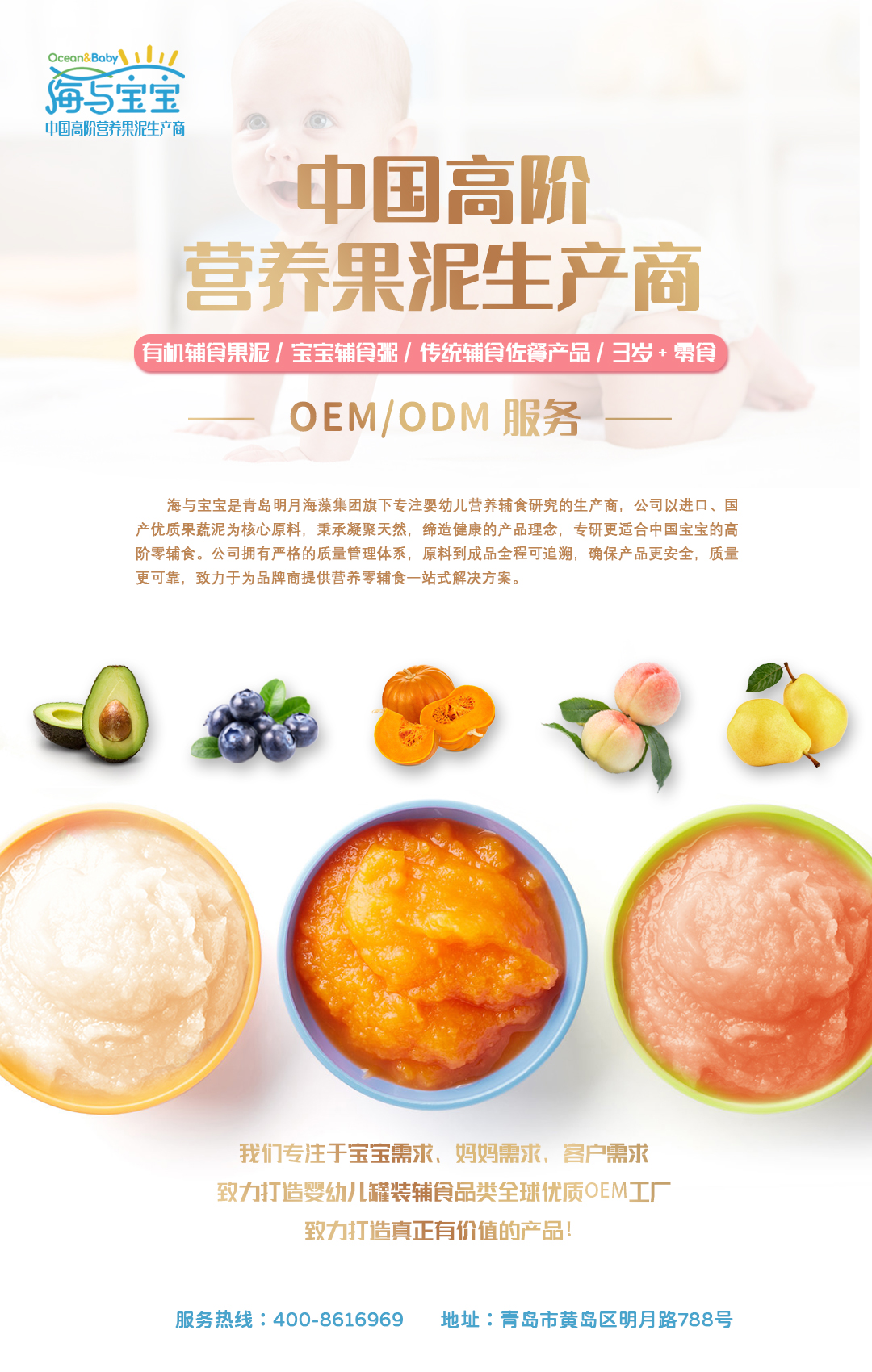 海與寶寶是青島明月海藻集團(tuán)旗下專注嬰幼兒營養(yǎng)輔食研究的生產(chǎn)商,公司以進(jìn)口、國產(chǎn)優(yōu)質(zhì)果蔬泥為核心原料,秉承凝聚天然,締造健康的產(chǎn)品理念,專研更適合中國寶寶的高階零輔食。公司擁有嚴(yán)格的質(zhì)量管理體系,原料到成品全程可追溯,確保產(chǎn)品更安全,質(zhì)量更可靠,致力于為品牌商提供營養(yǎng)零輔食一站式解決方案。